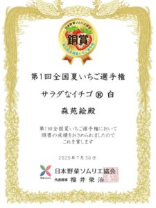 2025年7月30日、日本野菜ソムリエ協会主催の全国青果物選手権【第1回全国夏いちご選手権】で、当農園の「サラダなイチゴ®️白」が見事銅賞を受賞しました!